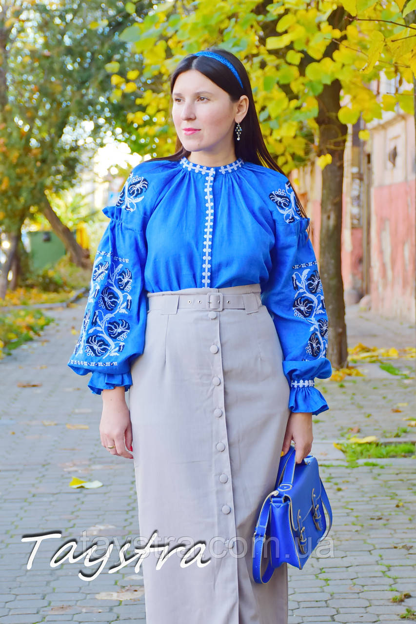 Блуза синя бохо, блузка вишита жіноча вишиванка етно стиль, вишита блузка, лляна блуза синя