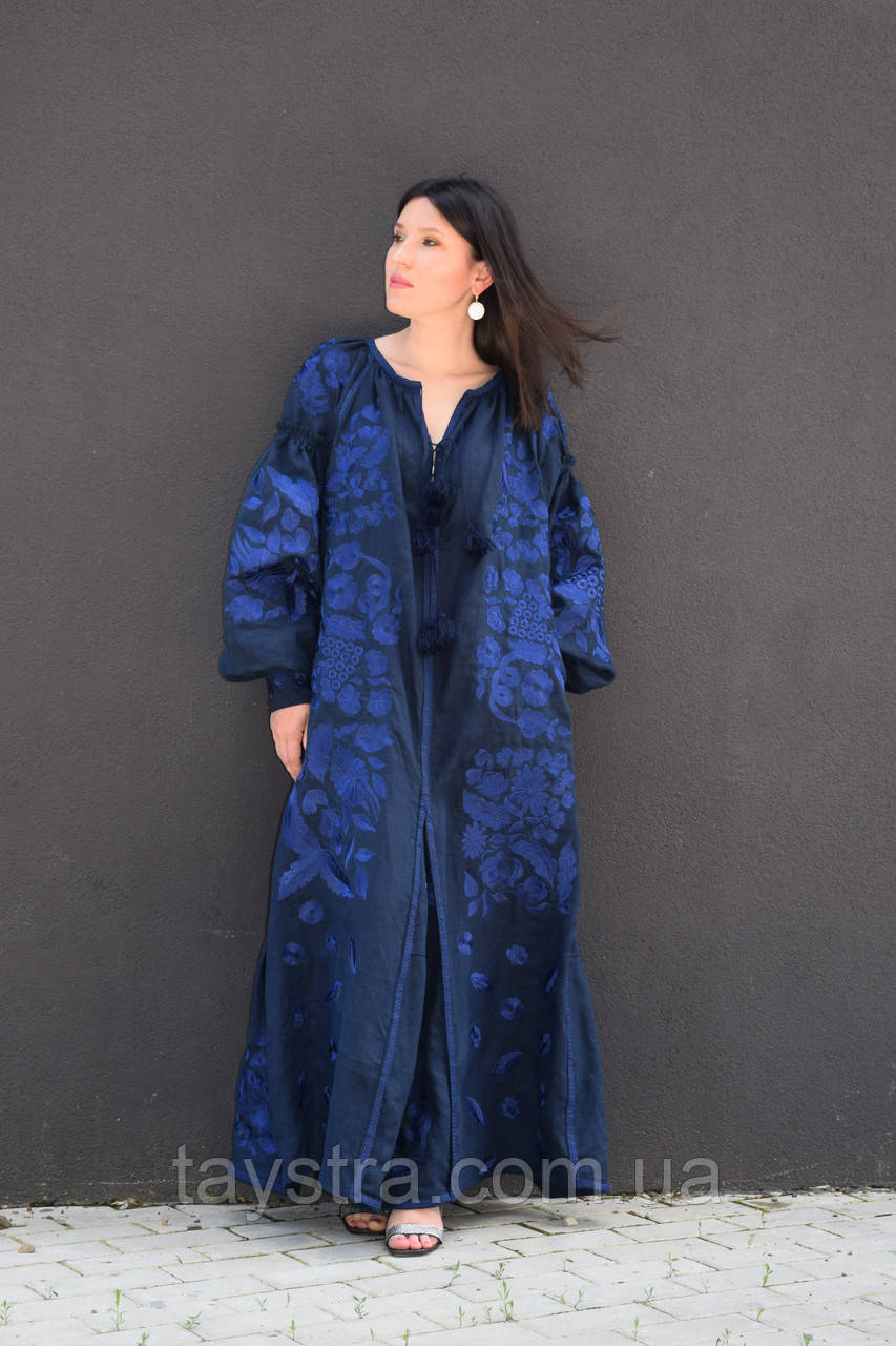 Синє плаття бохо, вишите плаття вишиванка льон, стильне синє плаття з вишивкою